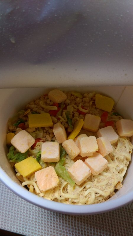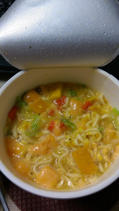 中を開けるとポタージュの元になるもの?みたいなのと、カボチャが見えます。 味は、思ったよりはさらっとしていた気がしますが甘い!w やはり、カップヌードルはシーフードが最強だなと思った昼でした。