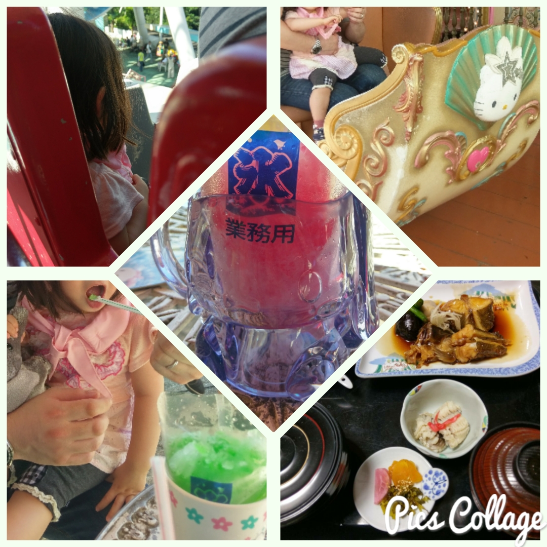 アフリカンサファリを後にした私達は、ハーモニーランドへ行く前にお昼にすることに。 立ち寄ったのは安定のファミレス。ちょっと前までは食べる物を持ち歩かなければいけなかったのに、 今はキッズメニューで食べれそうなものをチョイスしたり出来るようになったため、本当に楽になった。 ような気がするんですが、自分で食べる我が子の様子を見ていると若干落ち着かない。 自分のものをゆっくり食べれるようになるのは、まだまだ先のことのようです(笑)
